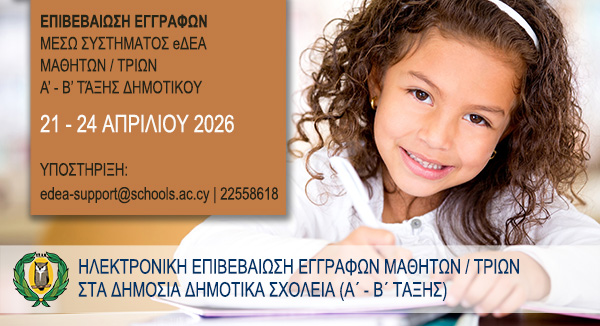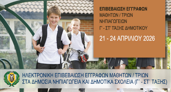 Η Διεύθυνση Δημοτικής Εκπαίδευσης του Υπουργείου Παιδείας, Αθλητισμού και Νεολαίας (Υ.Π.Α.Ν.), πληροφορεί τους γονείς και κηδεμόνες των μαθητών/ριών των δημόσιων Δημοτικών Σχολείων (τάξεις Γ΄- Στ΄) και Νηπιαγωγείων (4 4/12 - 6 χρονών) ότι η επιβεβαίωση των εγγραφών, για τη σχολική χρονιά 2026-2027, θα πραγματοποιηθεί ηλεκτρονικά από τις 21 μέχρι και τις 24 Απριλίου 2026.